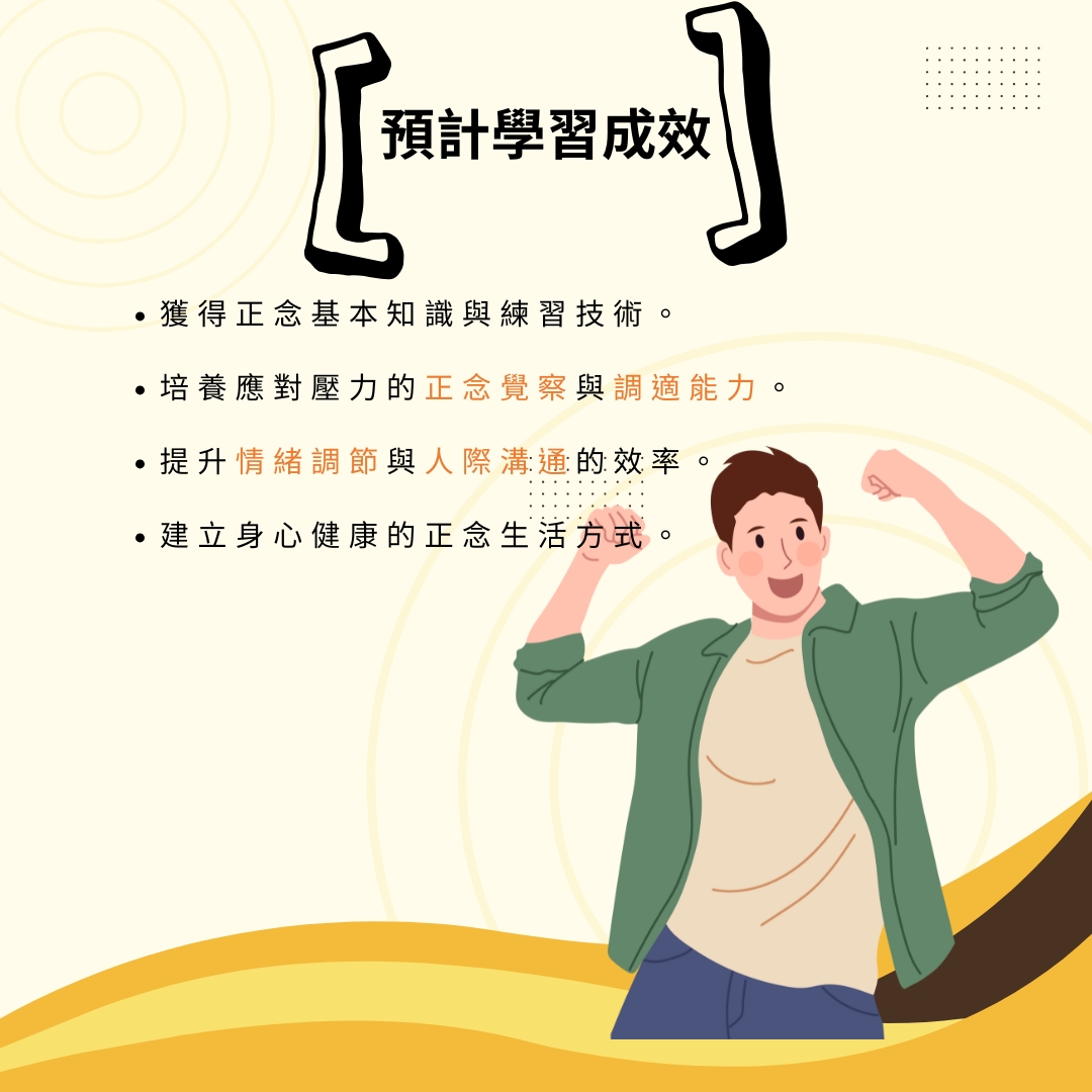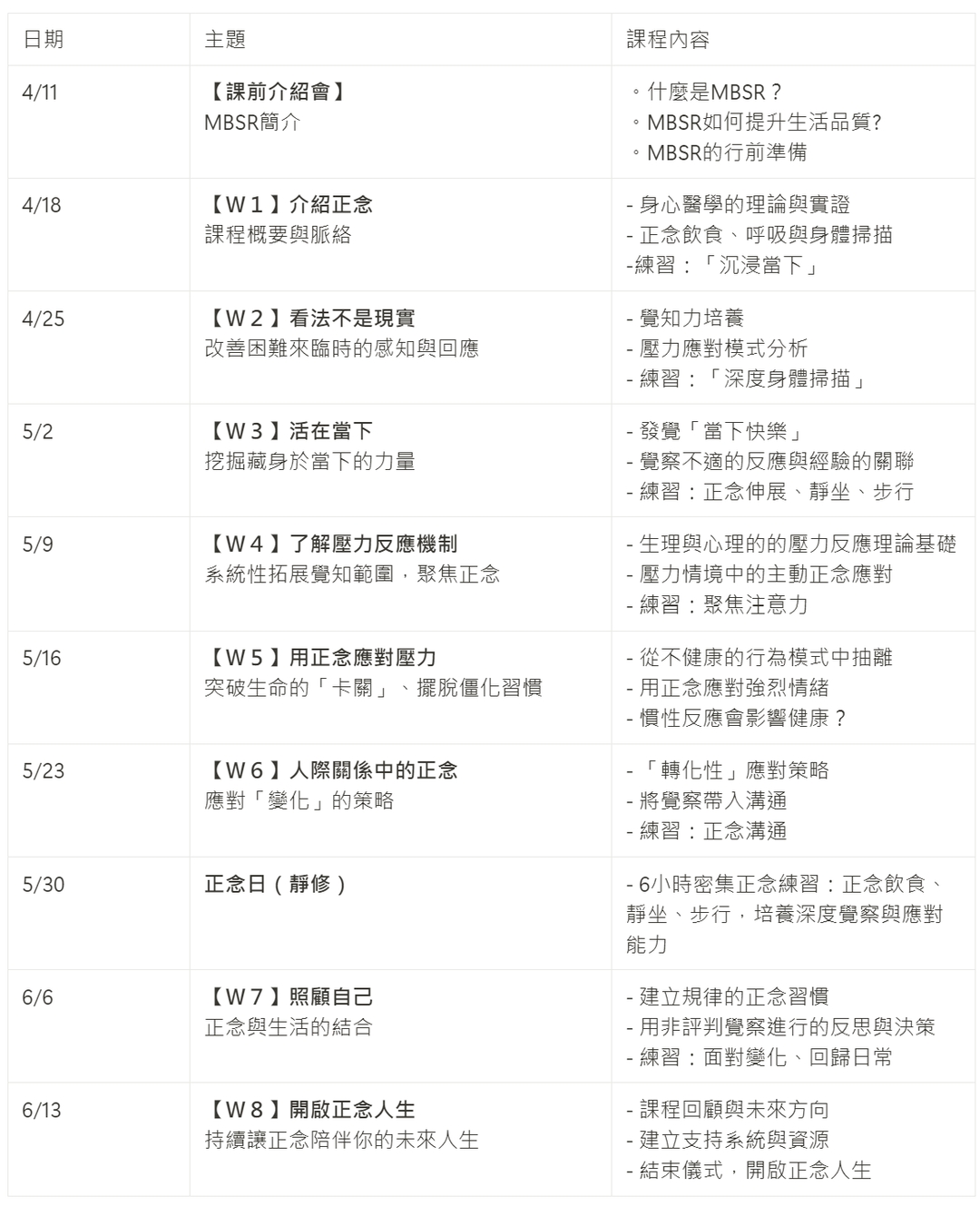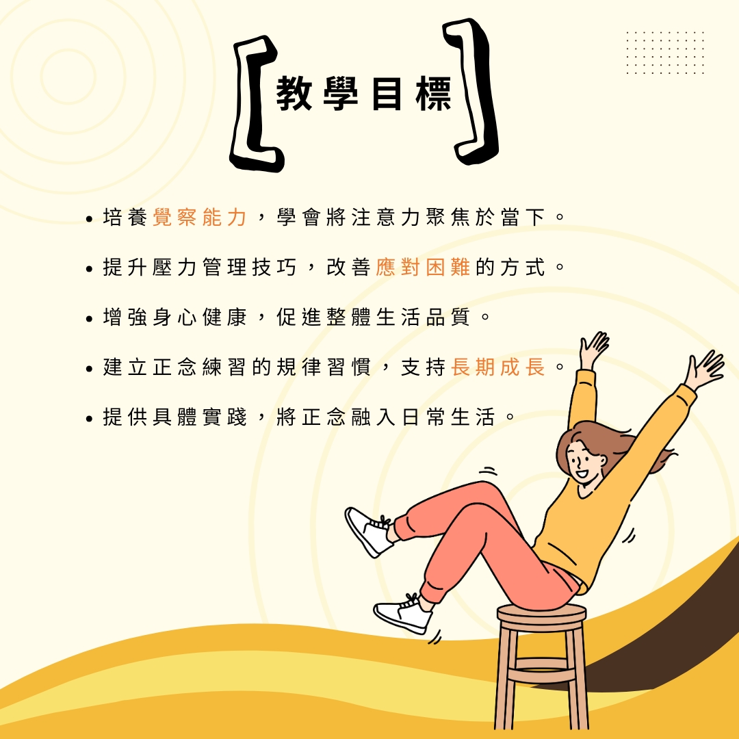 - 「課前介紹會」為必修環節,目的是協助您了解課程全貌、體驗正念練習方法,並釐清課程方向,以確認是否符合您的個人需求。