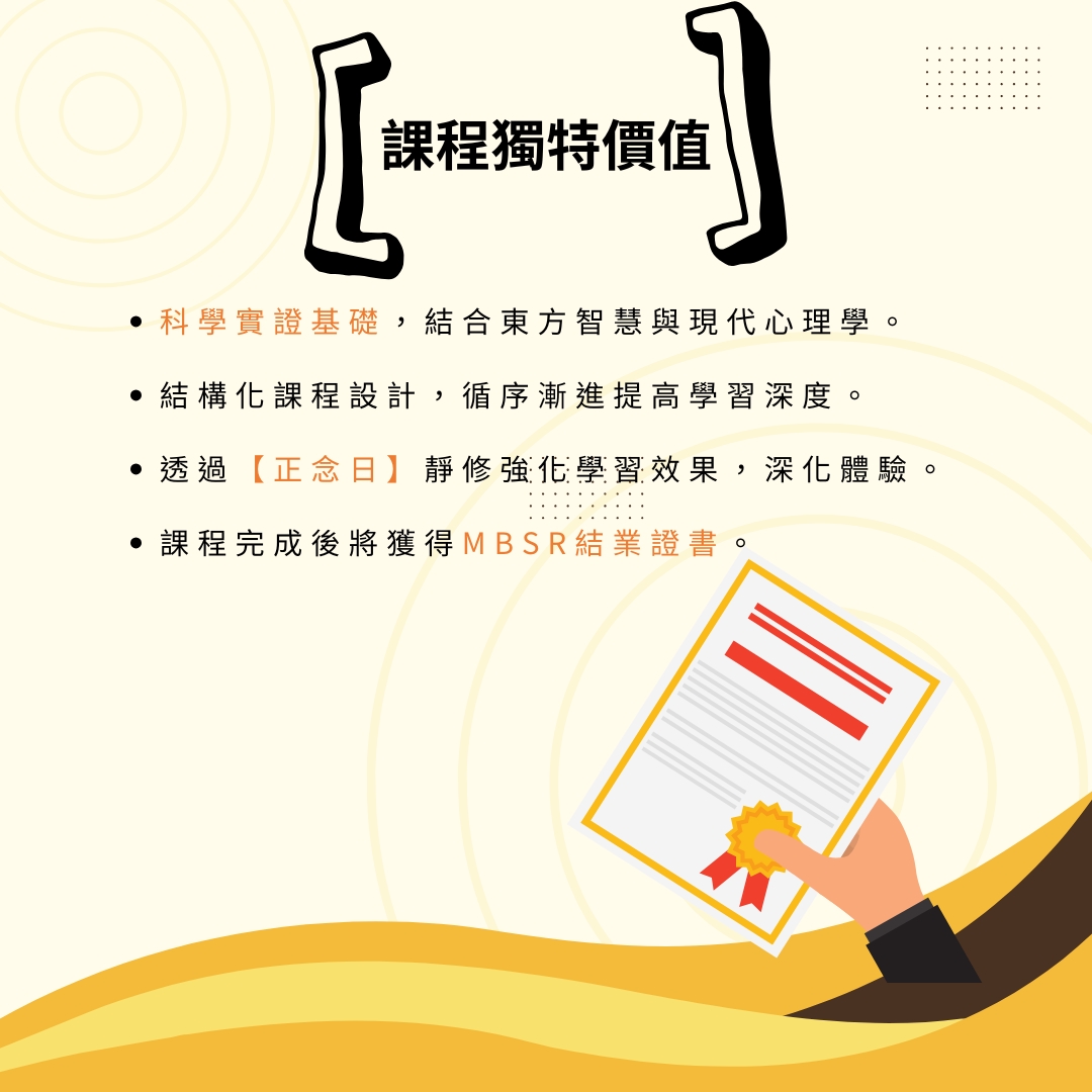 - 完整修畢課程的學員將獲得老師簽署的《正念減壓MBSR八週課程證書》。此證書為報名MBSR師資培訓的必要條件,但並不等同於具備開設任何正念減壓MBSR相關課程的資格。