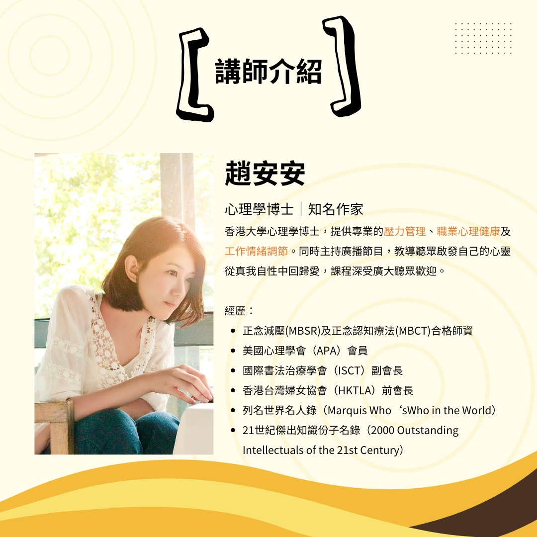 香港大學心理學博士,常為企業提供專業的壓力管理、職能評估、職業心理健康及工作情緒調節。同時主持廣播節目,教導聽眾啟發自己的心靈,從平靜中發現勇氣,從真我自性中回歸愛,課程深受廣大聽眾歡迎。