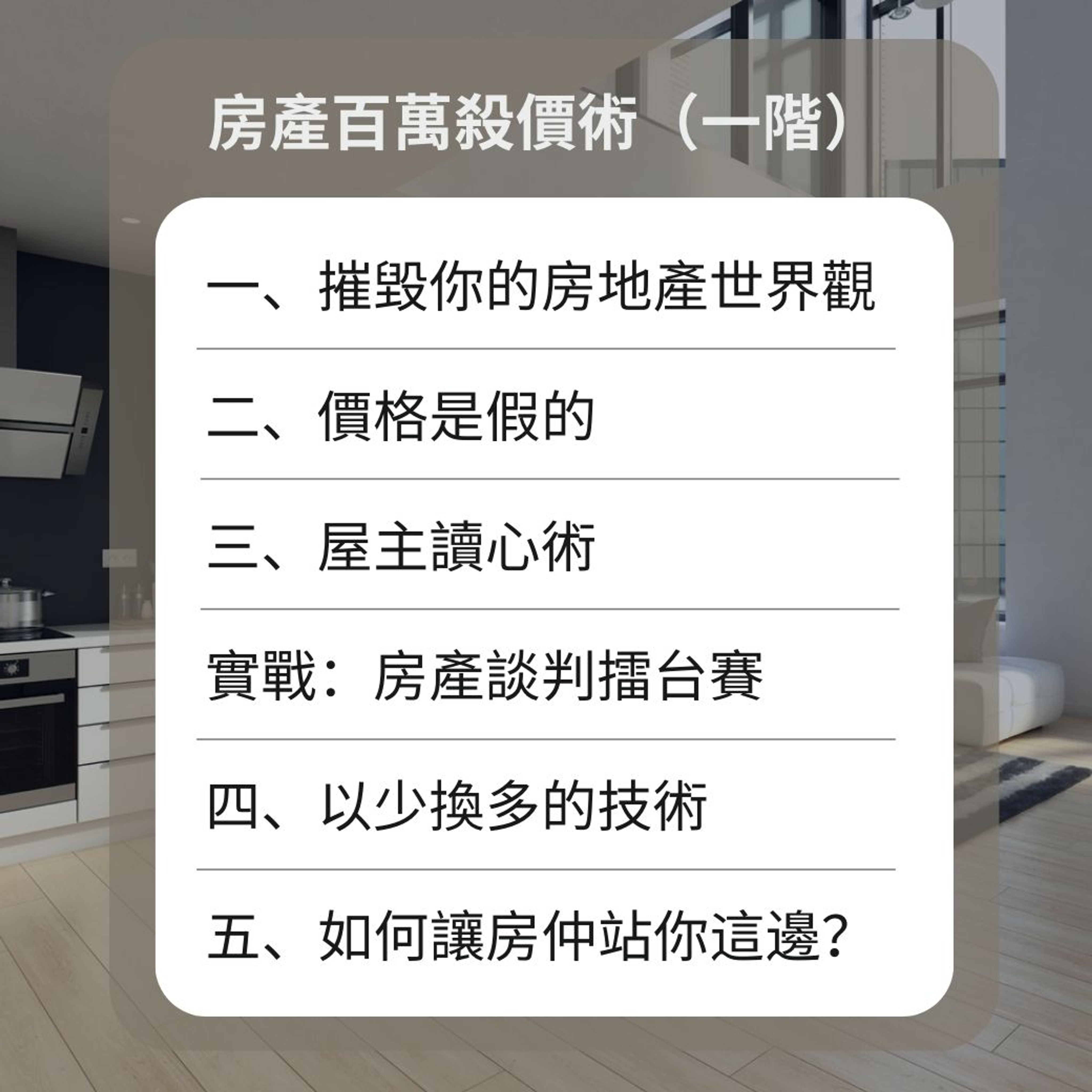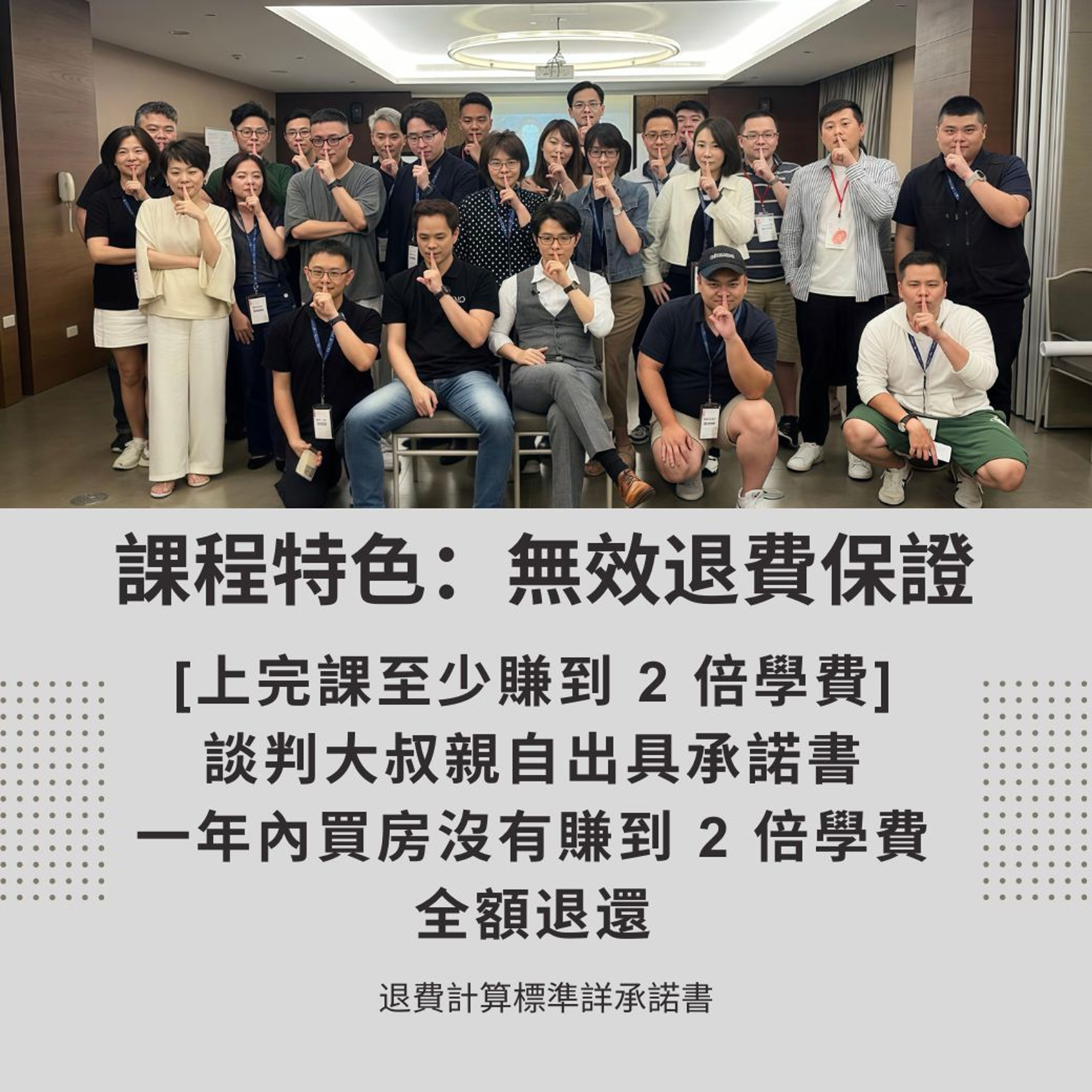 談判大叔擁有豐富的不動產買賣經驗,透過現場實戰練習與即時覆盤,再加上 3 個月的課後陪跑群組,讓你深入掌握買房談判心法,保證賺回學費。